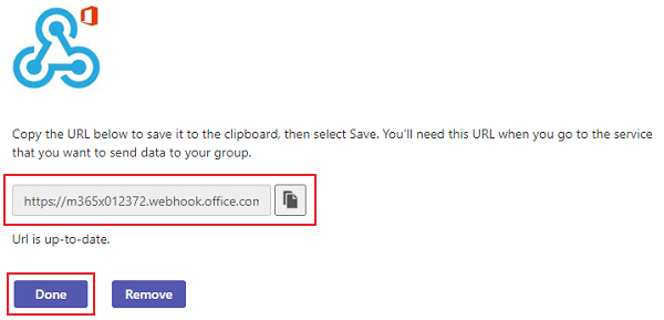 Copy and save the unique webhook URL present in the dialog. The URL maps to the channel and you can use it to send information to Teams.